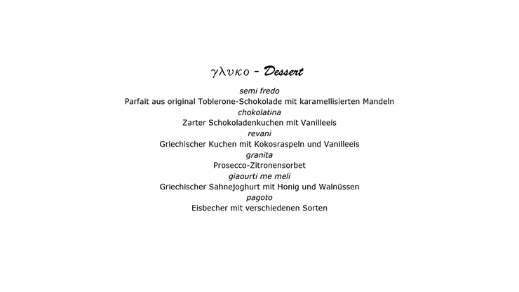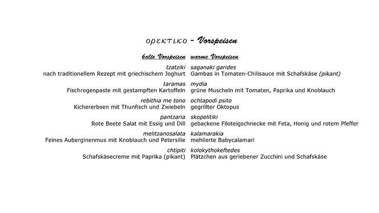 Unser Fokus liegt auf der Zusammenstellung authentischer griechischer kalter & warmer Vorspeisen - der "Πικιλια". Nach griechischer Art werden diese am Tisch präsentiert und von jedem persönlich nach den eigenen Vorlieben zusammengestellt.