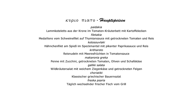 Alle unsere Gerichte sind typisch griechisch, dennoch verzichten wir auf Gyros und überladene Fleischplatten. Inspiriert von traditionellen Rezepten, versuchen wir unsere Gäste mit neuen Zutaten und besonderen Geschmacksnoten zu begeistern.