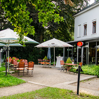 mit romantischen Elementen. Inmitten der Gartenanlage mit ihren alten Baumbeständen befindet sich unser Biergarten. Im Eingangsbereich des Restaurants schließt sich außerdem ein moderner Wintergarten an und lädt zum Verweilen ein. Das Team